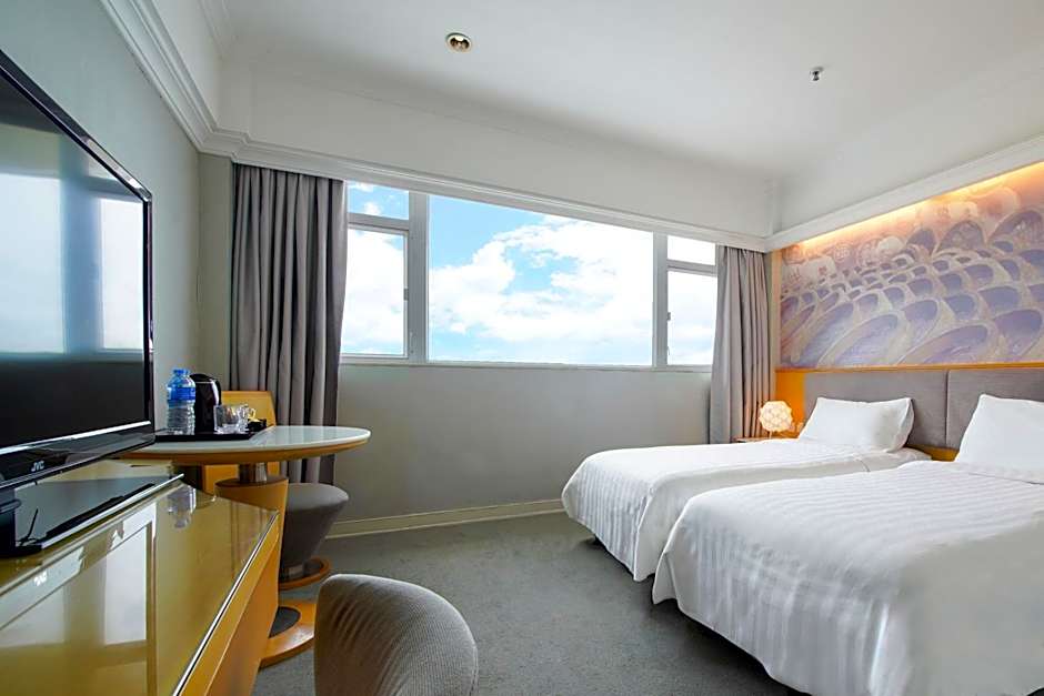 This twin room features two twin beds, a flat-screen TV, a fridge, a water kettle, a safety deposit box, and a seating area. Complementary bottled water, tea bags, and snacks are provided.